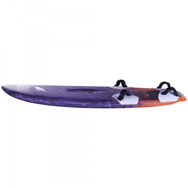 The outline remains fairly parallel towards the tail, providing a wide planing surface and creating a stance that allows the rider to generate maximum fin power and maintain control in all circumstances. The thoughtfully positioned foot straps allow riders to efficiently distribute power, while making it easy to get in and out of the straps for jibes. The wide tail contributes to maintaining speed through the jibes and greatly improves early planing and acceleration.
